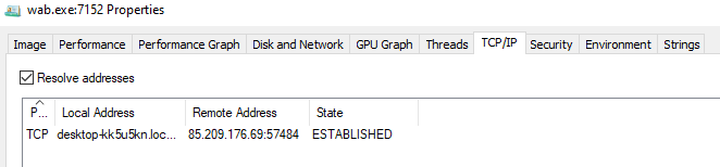 Additionally, WAB.exe is configured to send communications to a C2 Server (85[.]209[.]176[.]69).