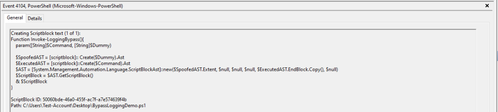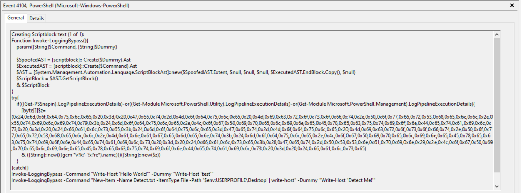 Here, an AST for a ScriptBlock Object is created using a Spoofed AST (The command to display in the logs) and an ExecutedAST (What we want to execute). Using the function Invoke-LoggingBypass will create a 4104 (ScriptBlock Logging) event in the PowerShell operational event log with the value of our Dummy command while executing the malicious command in the shell.