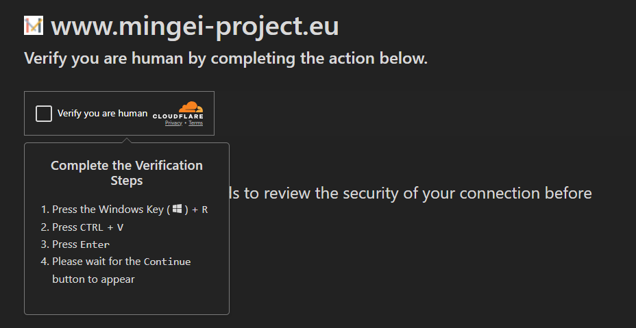 As with most ClickFix infections, the user had visited a compromised WordPress site that used a redirect service to serve a malicious ‘Fake Captcha’ site. The original domain the user intended to visit (mingei-project.eu) was compromised and included embeded code that led to the threat actor controlled infrastructure (security.clodufshield.com). This redirect was facilitated through another domain, goclouder.com.