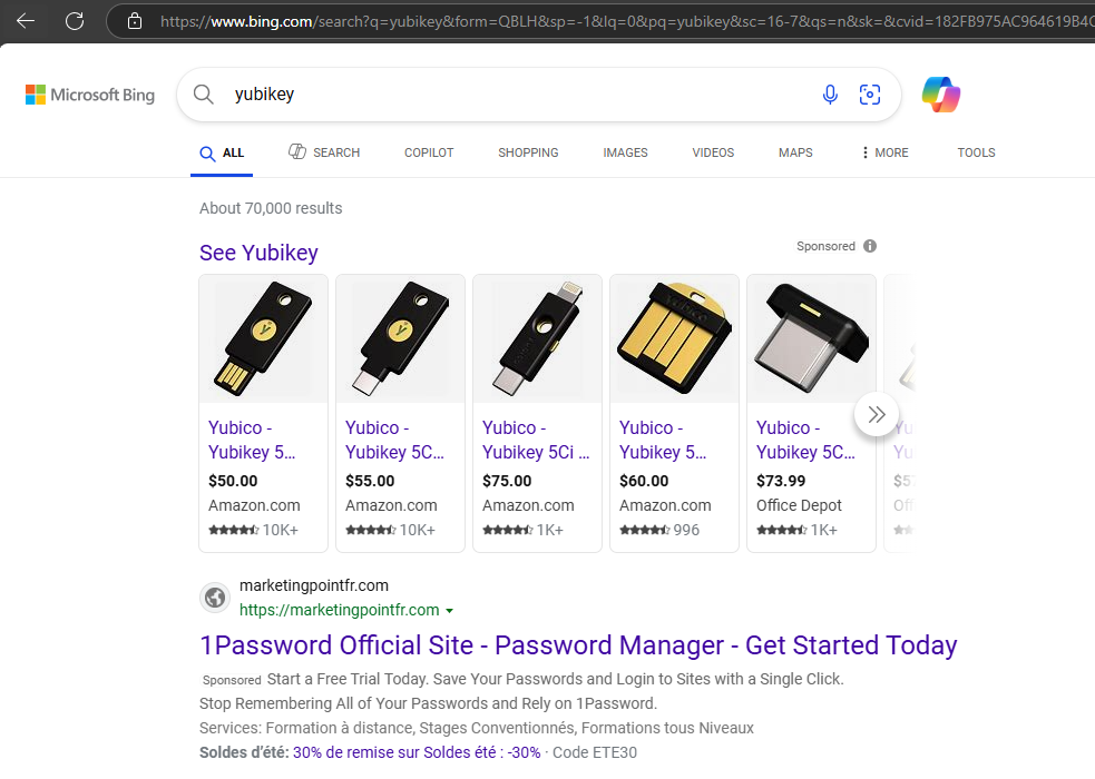 The initial investigation revealed that the user had fallen for an SEO poisoning attack that directed victims to a ClickFix page claiming to be associated with 1Password. They had been searching for yubikeys in Bing, and the first suggested result was a malicious domain. They followed the instructions on they were given by the ClickFix page, which prompted the retrieval and execution of the RAT.